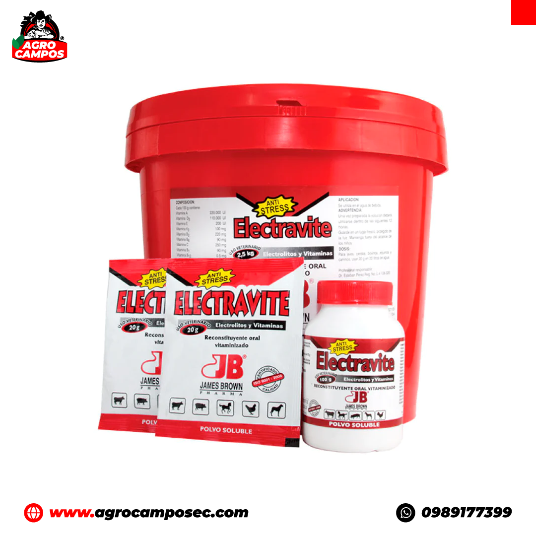 Electravite es un polvo soluble que combina un conjunto completo de multivitaminas y electrolitos, diseñado para prevenir y aliviar el estrés en animales debido a variaciones climáticas, transporte, vacunaciones, despique, deshidratación, prácticas de manejo inadecuadas y deficiencias nutricionales.