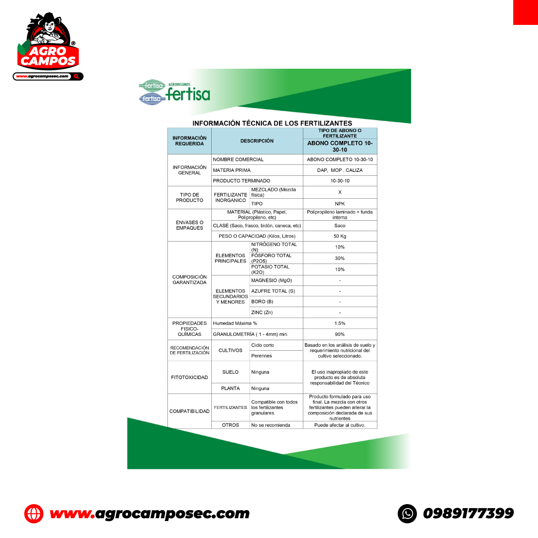 Abono Completo 10-30-10 es una fórmula equilibrada que aporta nitrógeno, fósforo y potasio, asegurando una nutrición completa para una amplia variedad de cultivos. Su composición mejora el desarrollo radicular, el crecimiento vegetativo y la producción de frutos, fortaleciendo las plantas contra enfermedades y optimizando la rentabilidad agrícola.