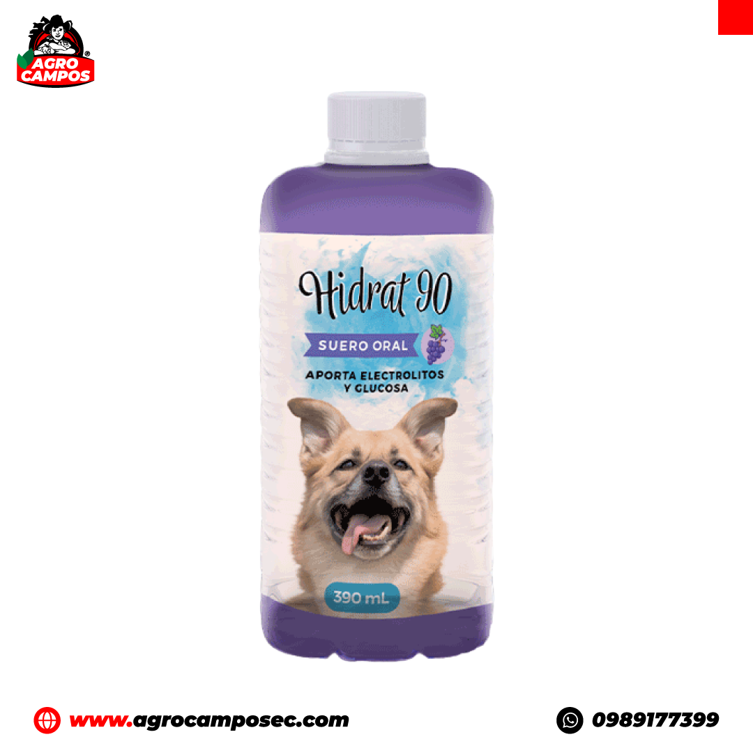 Hidrat 90 es un suero oral formulado con electrolitos esenciales (sodio, potasio y cloro), bicarbonato y glucosa, diseñado para el tratamiento de la deshidratación ocasionada por diarrea, vómito, anorexia o pobre condición corporal en animales. Su composición permite una rápida rehidratación, restaurando el equilibrio electrolítico y proporcionando energía inmediata.